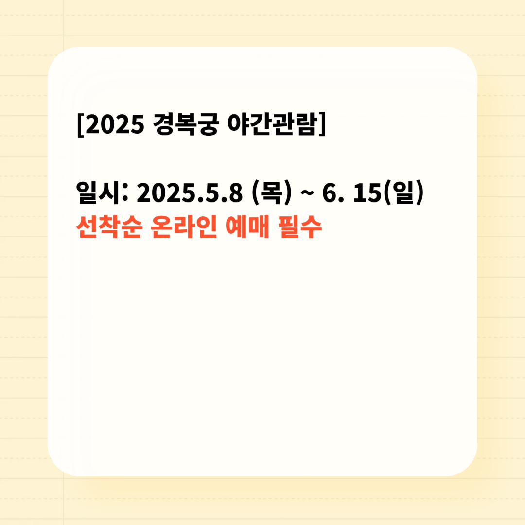 2025년에도 경복궁의 야경을 즐길 수 있는 기회가 찾아옵니다. 이번 포스팅에서는 2025 경복궁 야간관람의 예매 방법과 주차장 정보, 그리고 관람 시 유의사항에 대해 자세히 알아보겠습니다. 경복궁 야간관람 예매👆 경복궁 야간관람 공지사항👆 경복궁 야간관람 주차장👆
